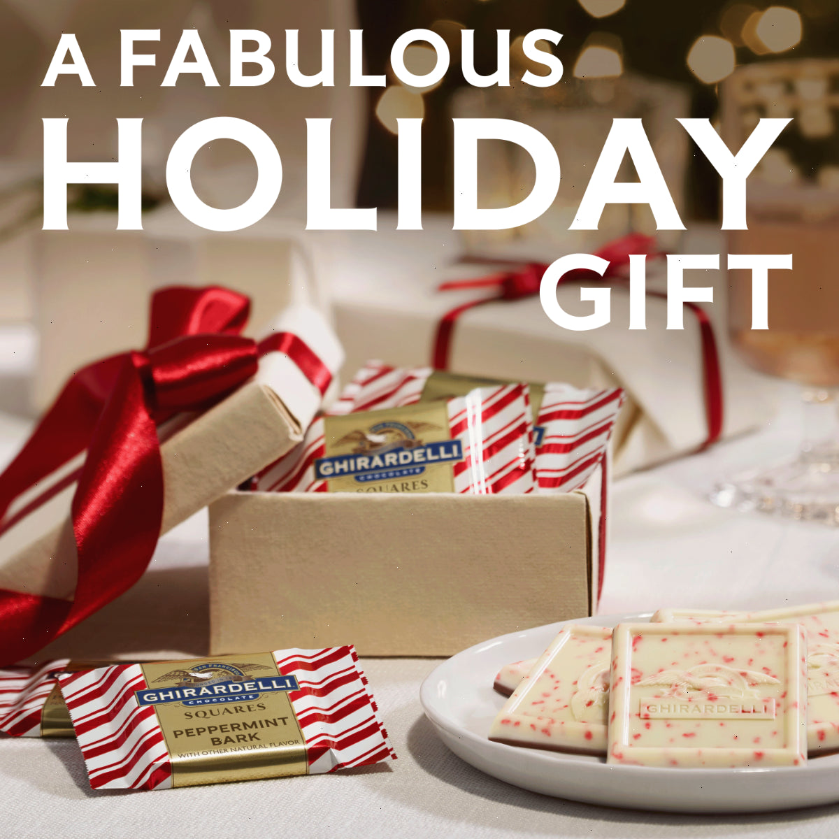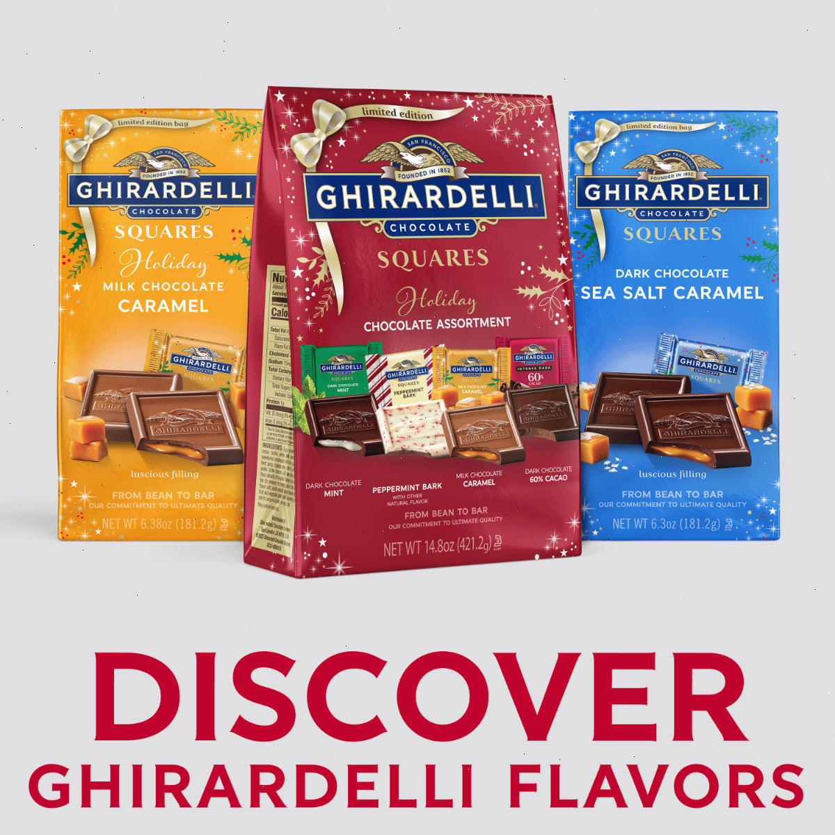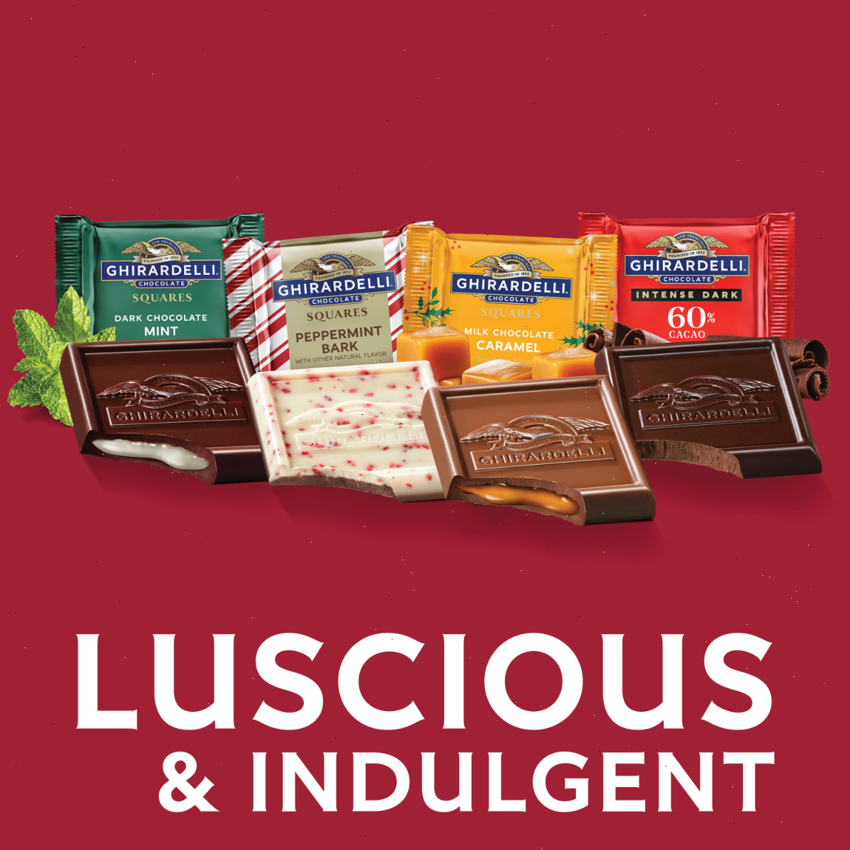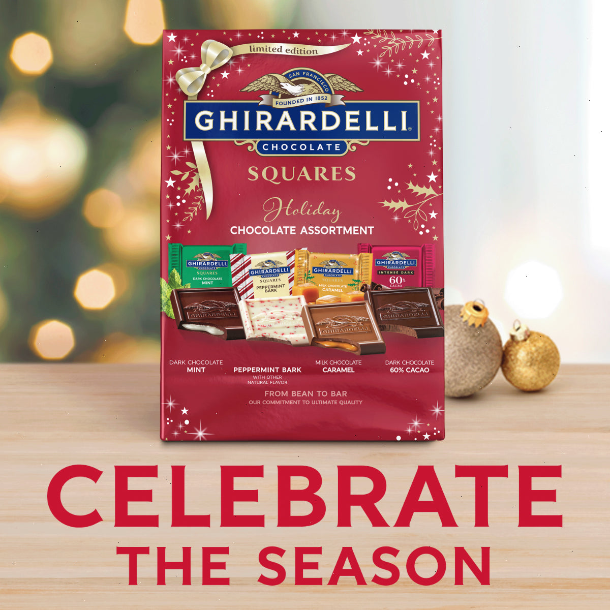 Celebrate the Christmas season with GHIRARDELLI Limited Holiday Chocolate Assortment SQUARES. These SQUARES are a delightful mix of milk chocolate caramel, dark chocolate mint, peppermint bark, and Intense Dark 60% cacao dark chocolate. Perfect for Christmas gatherings or as a thoughtful gift, these chocolates will surely bring joy and smiles. They're ideal for sharing with loved ones, giving as a special Christmas gift, or simply indulging in a well-deserved treat. Each GHIRARDELLI SQUARE is carefully crafted with premium ingredients and high quality cocoa beans. GHIRARDELLI Makes the Holidays A BITE BETTER.