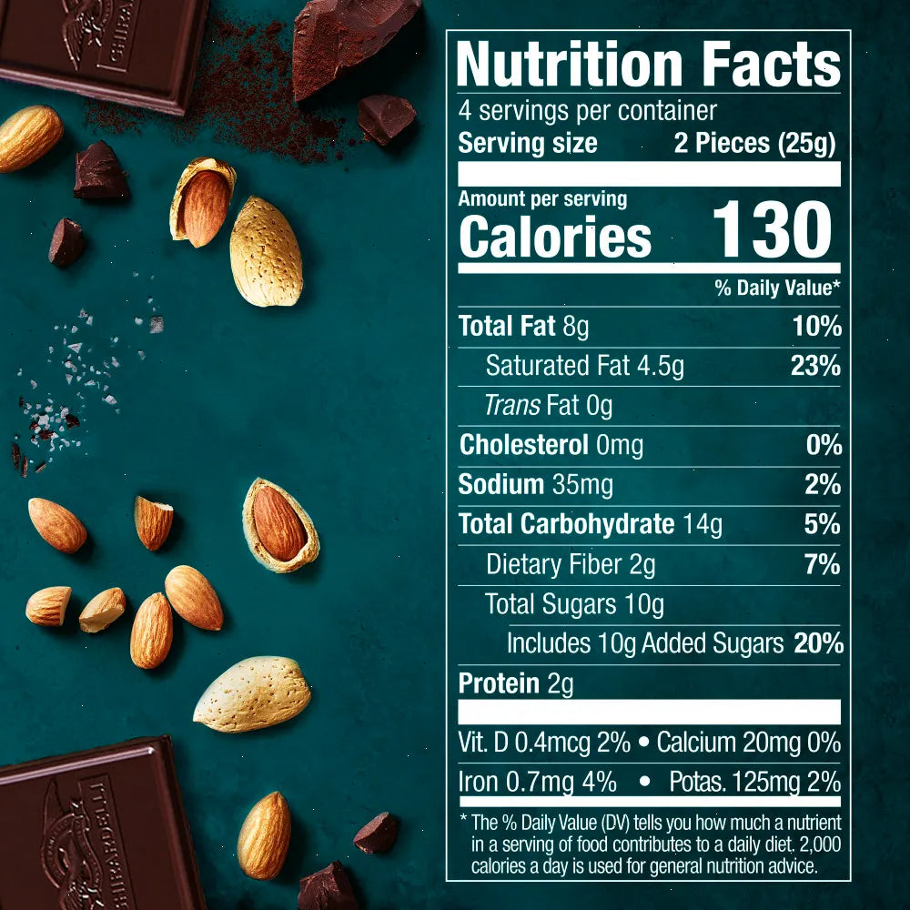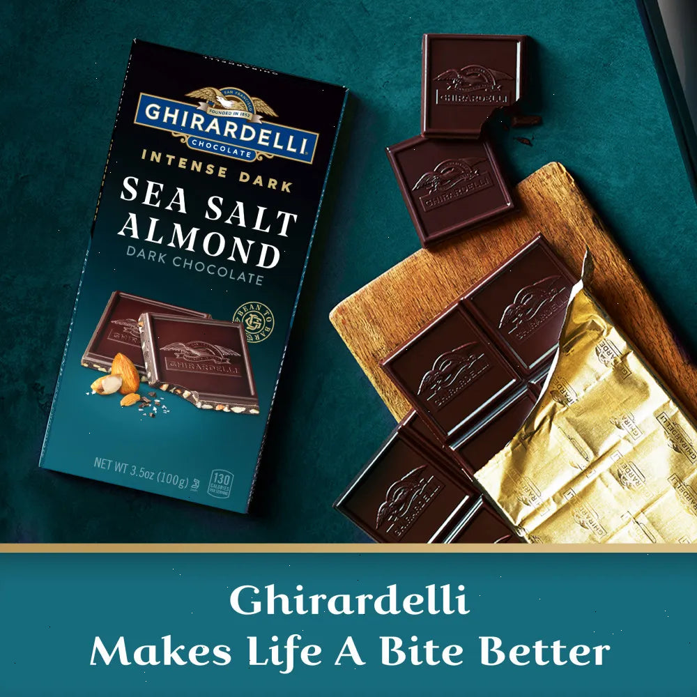 Enjoy a decadent experience with GHIRARDELLI Intense Dark Sea Salt Almond Dark Chocolate Bars. This case of 12 dark chocolate bars is crafted with high-quality cocoa beans and skillfully blended with roasted almonds and sea salt for an irresistible combination of salty and sweet. Each intensely delicious square caters to your senses and perfect for after dinner treat!